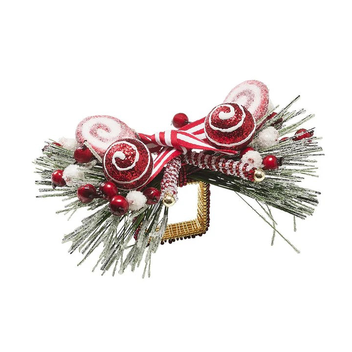 Add a touch of holiday sparkle and joy with the whimsical Holiday Twist Napkin Ring. Crafted by hand, this festive napkin ring features traditional red and white beaded candy, pinecones, faux berries, and frosted branches. The holiday mix evokes the nostalgia of a wintry Christmas morning, setting the stage for a cheerful celebration.