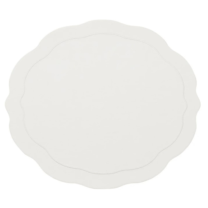The traditional oval shape gets a modern refresh with the matte faux leather ivory Tailored Placemat. A stylish wavy edge and embroidered tone-on-tone border detailing elevate this faux leather accessory. The subtle ivory variation is suitable for various entertaining themes, whether it's a candlelight dinner, a summer rooftop event, or everything in between. This versatile placemat effortlessly adapts to both dressed-up and more laid-back settings.