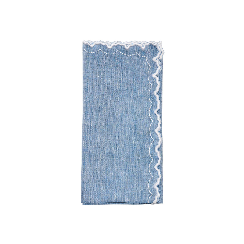 Characterized by a thick, embroidered geometric edge and delicate pick-stitching, the Arches linen napkin offers a contemporary update to the standard linen napkin with a chambray blue canvas. Its versatile design seamlessly transitions from formal dining to more casual settings.