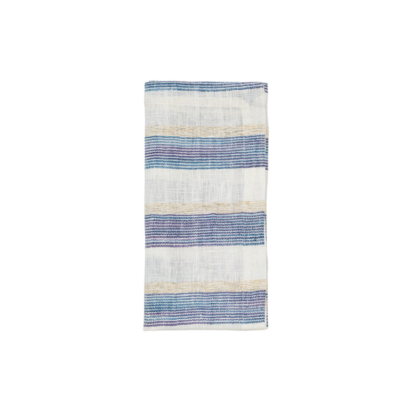 The Broad Stripe Napkin is a dependable darling that's always chic. Featuring tie-dyed threads by master artisans, it is a haute remix of cabana stripes in blue and white with wisps of sunlit metallics. Complete the look with the coordinating tablecloth for a truly coastal and sun-drenched table setting style.