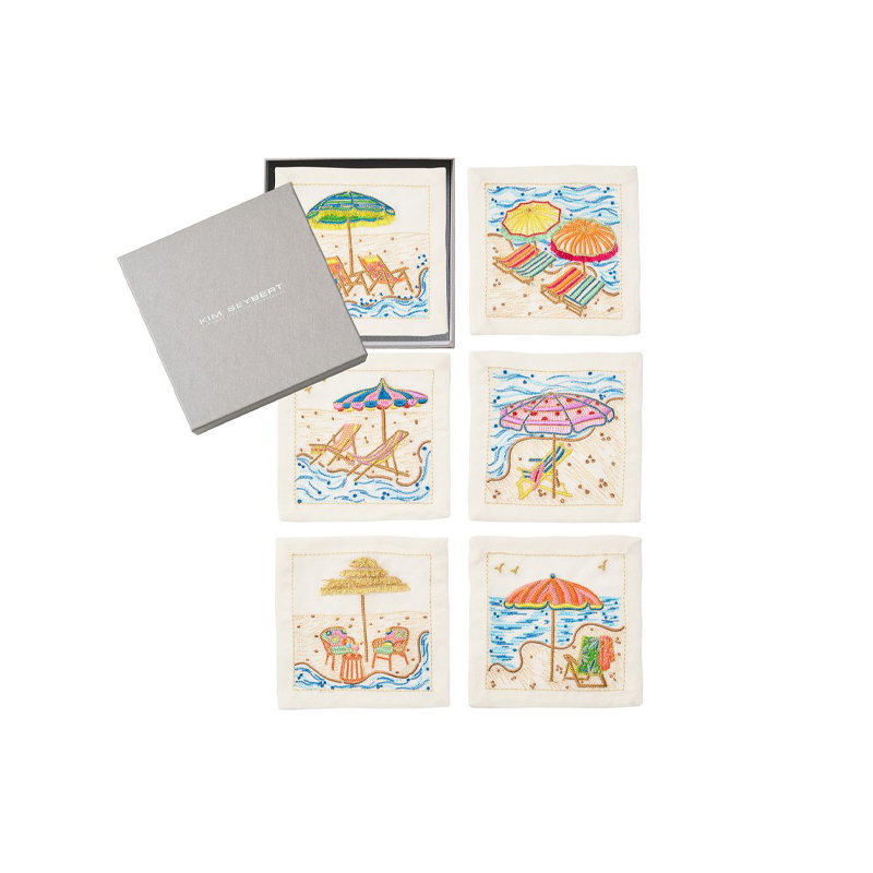 Soak in the Sunny Isles Cocktail Napkin Set for vacation vibes that never need to end. Each embroidered beach scene serves as a chill setting for cocktails that are always ready to make a splash. Whether you?re seaside or poolside, always have these handy especially when serving margaritas and ros?. They also make for sizzling hostess gifts come summertime.