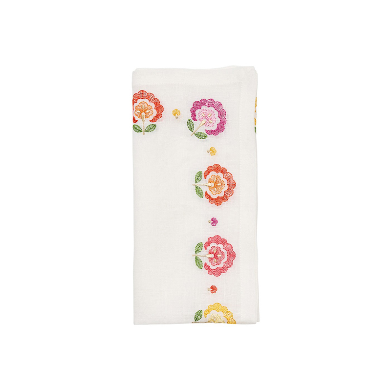 The Carnation Napkin captivates with embroidered florals that fuse vibrant colors and an extra fanciful dose of gold to reflect the petal?s quaint ruffles. As a timeless emblem of devotion, this carnation trim in pink and orange is precious yet modern. For garden luncheons, summer weddings and everyday meals, complete the look with the coordinating tablecloth.