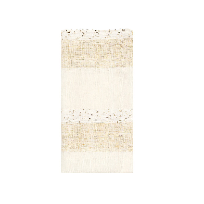 A flash of the cinematic. The Spectra Napkin unfolds diaphanous stripes of creamy white, sumptuous gold, and hand-sewn sequins for composed radiance. Pair it with the Spectra Tablecloth and Napkin Ring to add layers of cascading light. This is the napkin for formal occasions and grand celebrations.