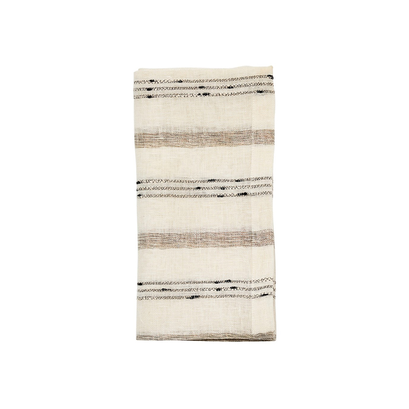 With a balance of black, white, and parchment palettes, the Stria Napkin plays up stripes across a linen canvas. Hand spun slubbed yarn adds graphic texture with the delicate artistry of calligraphy ink on place cards. Style with the coordinating Stria Tablecloth for an unforgettable setting.