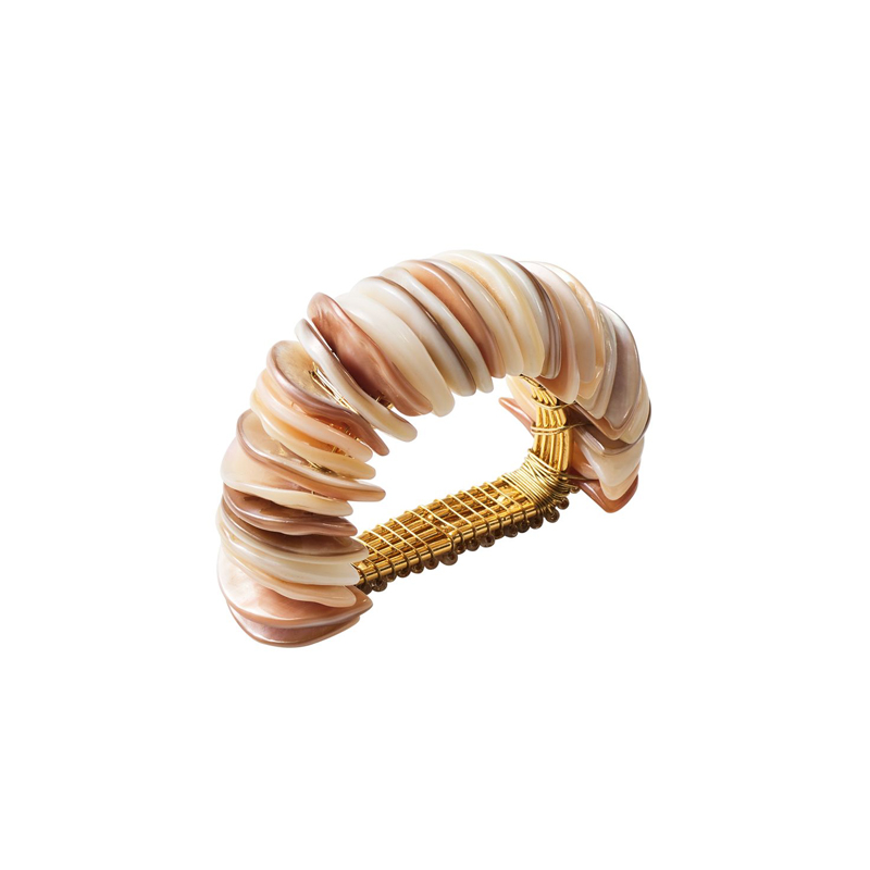 In a refreshing wave, the Shell Arc Napkin Ring strings together natural, sand, and ivory hued shells. Layered shell pieces like a mille feuille. The natural allure of mother-of-pearl, jingle shells, and coastal gems soars in this summer entertaining essential.