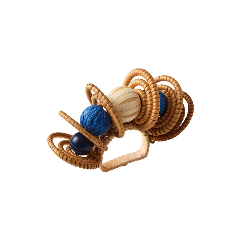The Calypso Napkin Ring channels the relaxed style of oversized beach bangles at the table. Raffia-wrapped bands and hand-dyed wooden beads weave in blue and natural hues easily bring a casual and relax flair to table settings. Pair this napkin ring with the matching napkin, placemat, and runner to create a stunning tablescape.